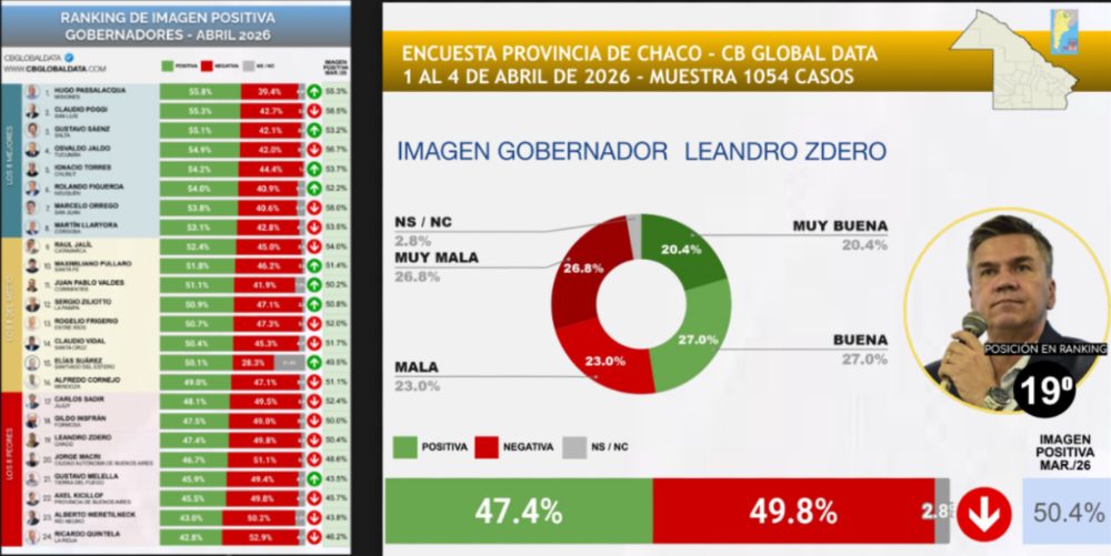 El mandatario chaqueño pasó del segundo lugar en la tabla (en junio pasado) al furgón de cola bien entrado 2026 según CB Global Data Consultores. Salarios congelados, tarifazos, desempleo y sobreendeudamiento de las familias explican el malestar que se traduce en esta valoración ciudadana en picada.