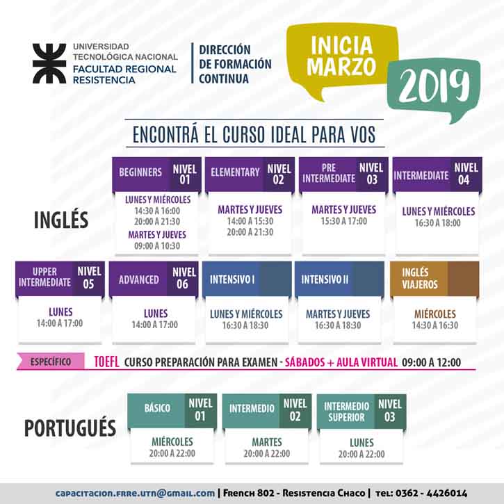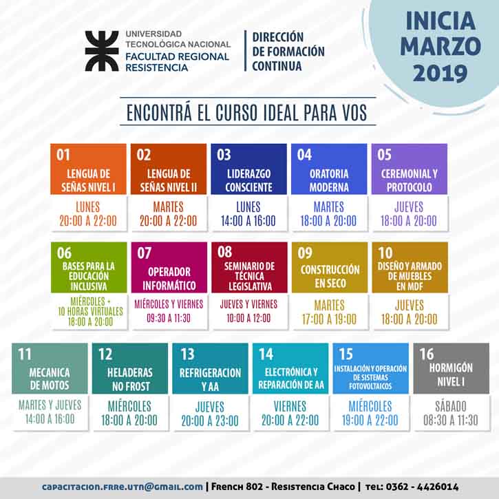 Para informes e inscripciones, concurrir al Edificio Anexo de la UTN Resistencia, ubicado en French 802, o comunicarse al 4426014.