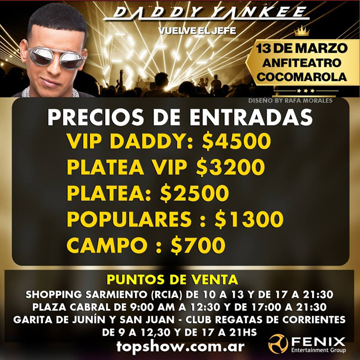 Autor de grandes éxitos como “La Rompe Corazones”, “Shaky Shaky”, “Llamado de Emergencia”, “¿Qué tengo que hacer?” y “Gasolina”, entre otros, Daddy Yankee buscará pisar con fuerza en Corrientes y deleitar con su música urbana a los fanáticos que hace meses esperan su regreso.