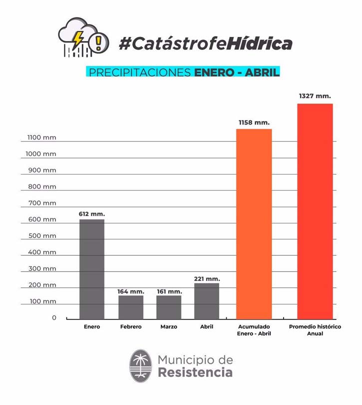 El mandatario municipal informó que se registró una concentración abrupta de lluvias en poco período de tiempo, por lo que solicitó a los vecinos que se mantengan en sus domicilios y eviten los traslados por la ciudad hasta que el temporal reduzca su intensidad. Con las lluvias caída durante esta jornada, durante abril ya se alcanzaron los 221, acumulando 1.158 milímetros en cuatro meses. Esto significa que, en un cuatrimestre, probablemente, se alcance el promedio anual histórico de 1.327 milímetros. “Vemos como sufren nuestros hermanos chaqueños en distintos lugares de la provincia. Lamento que esto ocurra y estamos poniendo el máximo esfuerzo para tratar de asistir a las familias afectadas”, aseveró el jefe comunal.