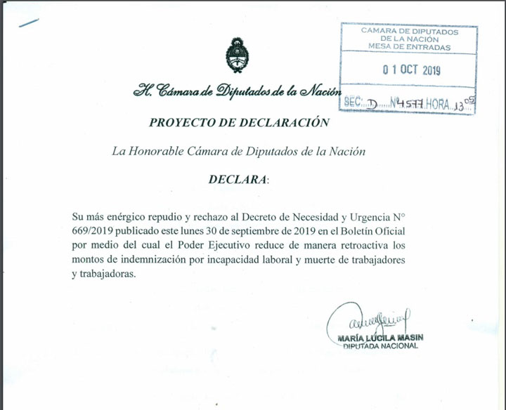 El proyecto de la legisladora del Frente para la Victoria expresa su “más enérgico repudio por el cual de manera retroactiva se reducen los montos de indemnización por incapacidad y muerte de trabajadoras y trabajadores”.