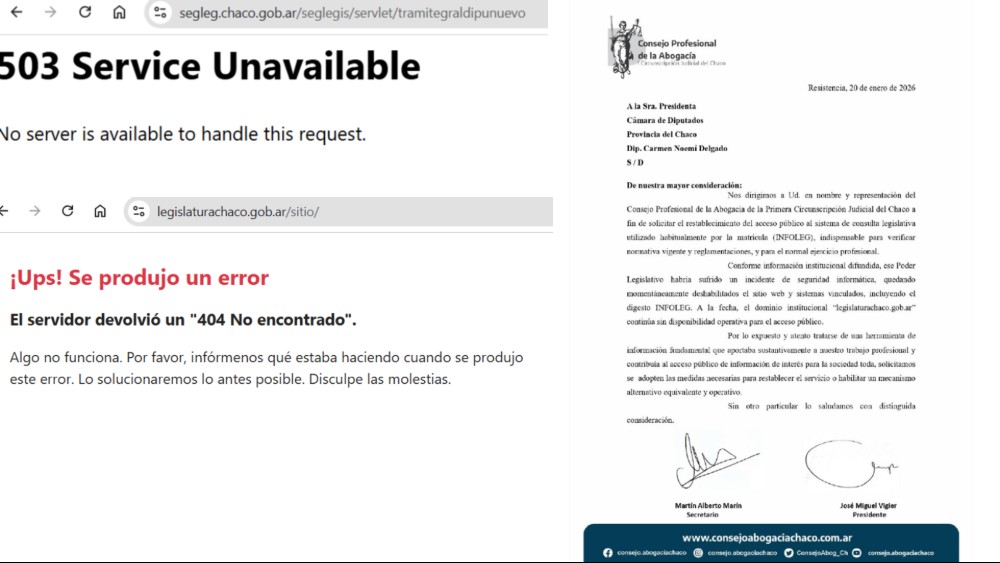 La nota, fechada el 20 de enero de 2026, advierte que el sitio institucional legislaturachaco.gob.ar continúa inaccesible tras el incidente de seguridad informática que afectó al Poder Legislativo. Esta interrupción dejó fuera de servicio el digesto legislativo y demás sistemas vinculados, generando un vacío informativo que impacta tanto en la labor jurídica como en el derecho ciudadano a acceder a información pública.