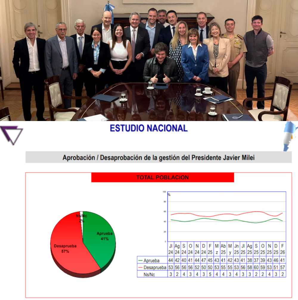 Números en baja Hugo Haime, uno de los consultores de mayor trayectoria en la Argentina, realizó un sondeo en los últimos días. “El 57 por ciento de la población desaprueba la gestión de Javier Milei. Tiene el respaldo del 41 por ciento. En febrero, en relación a diciembre, tenemos una caída en la aprobación de gestión de 5 puntos de 46 a 41. Y en la imagen personal de Milei desde 50 a 44. En mi opinión hay varios factores que se conjugan. Como dinámica general, cuando ganás una elección (la de octubre) crecés, pero cuando aparecen los problemas, volvés a valores que ya tuviste. En septiembre Milei tenía 37 de aprobación y cuando apareció el apoyo de Trump subió a 40. Quiere decir que está en un valor que ya tuvo. ¿Que explica para mí la baja? Inflación persistente desde diciembre. Ese es el problema que más preocupa en lo cotidiano, junto con los bajos salarios. También tenemos más de un 55 por ciento que cree que el gobierno no va a poder controlar la inflación. A la ley laboral ya en noviembre y diciembre se la percibía a favor de los empresarios. En ese momento había opiniones levemente negativas pero este mes nos encontramos con un 55 por ciento que la rechaza y sólo 36 por ciento que acuerda con ella. Importaciones y despidos. Creció el rechazo al 65 por ciento. Y eso antes, de Fate. La situación estructural sigue siendo la misma: el gobierno representa a un 40 por ciento. Recordemos que obtuvo 41 por ciento en las legislativas. El tema es que el otro 60 por ciento carece de una representación homogénea o de una propuesta de futuro. Que no solo sea un paro. Esa parece una etapa agotada para la oposición”.