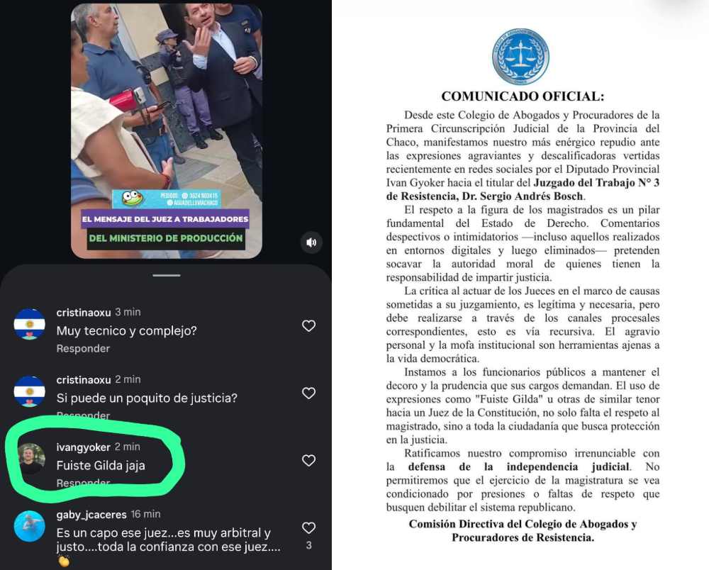 El comentario de Gyöker, uno de los primeros en la publicación en Instagram del sitio informativo Chaco TV Stream, generó una rápida reacción de distintos usuarios, quienes le pidieron explicaciones. El diputado oficialista borró el mensaje y horas más tarde ensayó un pedido disculpas, pero su explicación dejó más dudas que certezas. . En medio de la creciente tensión por el conflicto salarial en Producción, este hecho sacudió la institucionalidad provincial. Gyöker, estrecho colaborador del gobernador al punto que Zdero lo eligió presidente del interbloque oficialista, lanzó un preocupante mensaje contra el juez del Trabajo 3, Sergio Andrés Bosch, en una publicación periodística que informaba sobre el encuentro del magistrado con los trabajadores que reclaman la restitución del Fondo Estímulo Productivo.