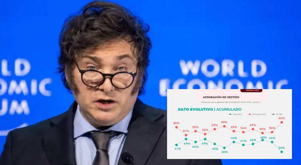 La administración de Javier Milei atraviesa su peor momento en la opinión pública. Un relevamiento nacional de la consultora Delfos, realizado entre el 13 y el 19 de marzo sobre 2.951 casos, muestra que la desaprobación a la gestión presidencial alcanzó el 64% —diez puntos más que en febrero— y que la imagen negativa del Gobierno trepó al 62%, doce puntos por encima del mes anterior. Los números configuran el registro más adverso desde que La Libertad Avanza llegó al poder.
