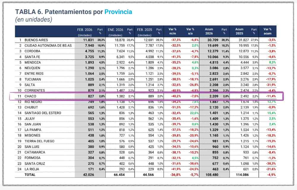 La caída no es un hecho aislado. En la comparación interanual, el Chaco retrocedió un 7% respecto de febrero de 2025, y en el acumulado del primer bimestre la baja alcanza el 11,4% (2.209 autos contra 2.492 del año pasado). Números que confirman que el bolsillo de los chaqueños ya no resiste.