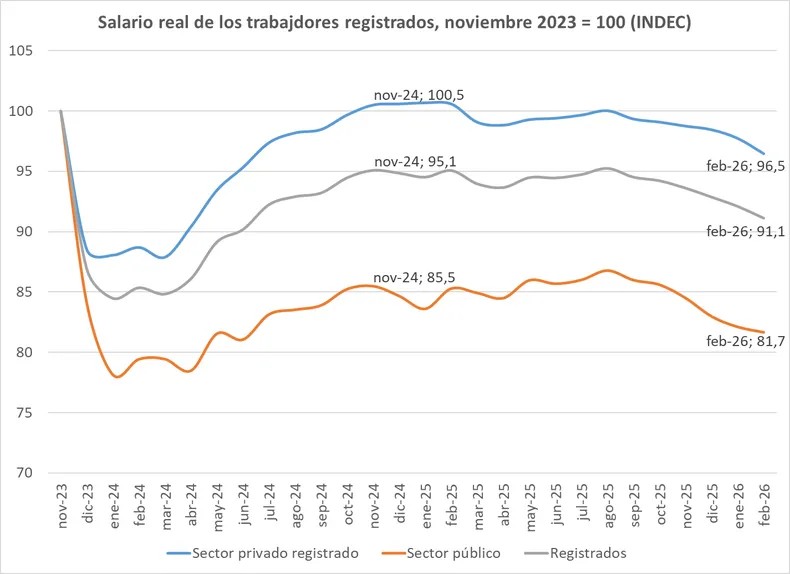 El salario real de los trabajadores formales privados y de los empleados públicos, cayó por sexto mes consecutivo en febrero: en promedio está un 8,9% abajo desde noviembre de 2023 (3,5% el sector privado, 18,3% el público). Los registrados se incrementaron 1,8%, frente a un índice de precios al consumidor (IPC) que subió 2,9% en igual período.
