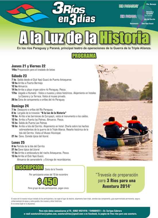 Las inscripciones, con cupos limitados, se encuentran abiertas, tienen un costo de $450 que debe abonarse en el momento en que se registran. Esto solventará el hospedaje, seguridad, un guía para la travesía y la comida. Las personas que se encuentren interesadas en formar parte pueden comunicarse al 0362-4431419 o por medio de aventura3rios@yahoo.com.