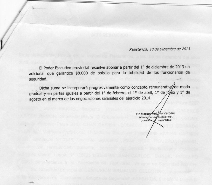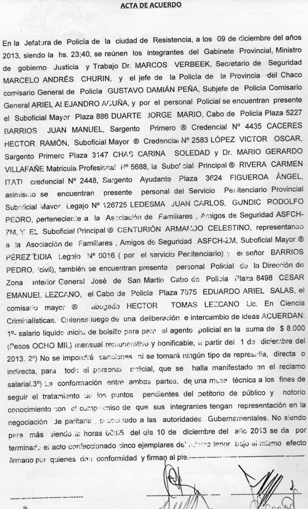 A propósito de los reclamos policiales, de las muertes, de los saqueos y de los actos vandálicos que asolaron gran parte del Chaco, el pasado lunes 9 se firmó un tardío acuerdo en el despacho del jefe de policía. Participaron el Ministro de Gobierno Marcos Verbeek y miembros de su gabinete, integrado por los Subsecretarios Juan Manuel Chapo y Aldo Luis Asano y el Secretario de Seguridad Marcelo Churin, más el Ministro de Desarrollo Social Roberto Lugo, todos en representación del gobierno chaqueño.