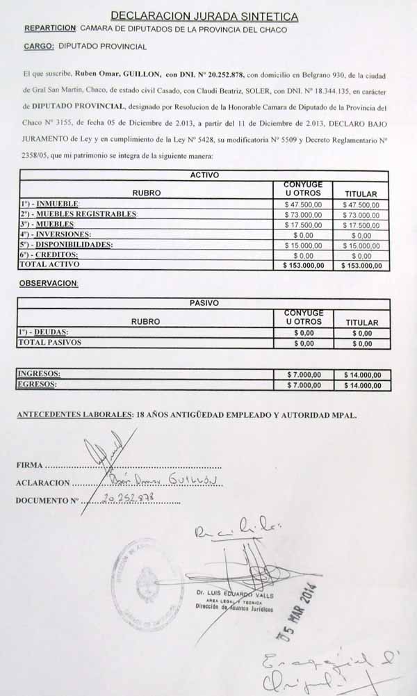 Tal cual como lo hizo en todos los cargos que le tocó ocupar en toda su trayectoria política el diputado Rubén Omar Guillón además de presentar su declaración jurada de bienes en la Cámara de Diputados hizo pública para que esté al alcance de todos los ciudadanos.