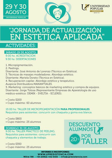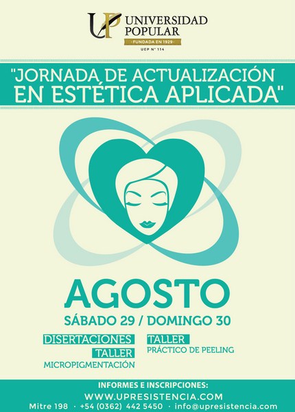 La Universidad Popular de Resistencia, continua brindando capacitaciones y actualizaciones académicas de excelencia En esta oportunidad, realiza la tercera edición de las "Jornadas de Actualización en Estética Aplicada" , dirigida a cosmetólogas, esteticistas, profesionales de belleza, peluqueros y público en general. Las inscripciones se realizan en la Universidad Popular y son de cupos limitados, y se desarrollará los días 29 y 30 de agosto en las instalaciones de la UP.