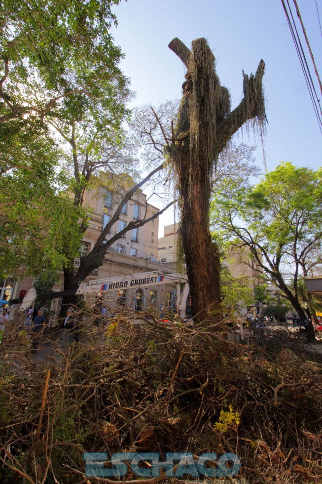 Una vez finalizado ese proceso, llegará el turno de la extracción definitiva, teniendo en cuenta que el ibirá pitá posee una antigüedad de aproximadamente 70 años. Al mismo tiempo, la comuna ejecutó trabajos de reducción de copas en un ejemplar arbóreo de la misma especie que está colocado en la cuadra frontal. Esta última tarea se realizó en base al pedido de referentes del juzgado que funciona allí.