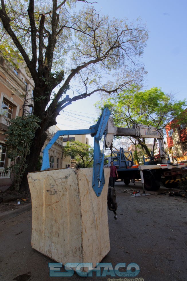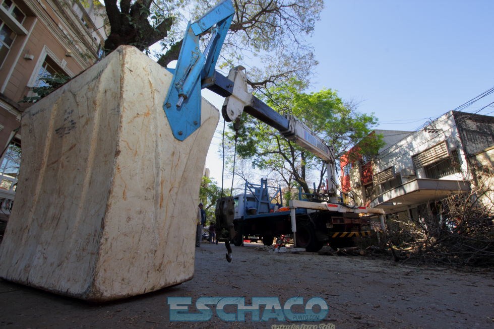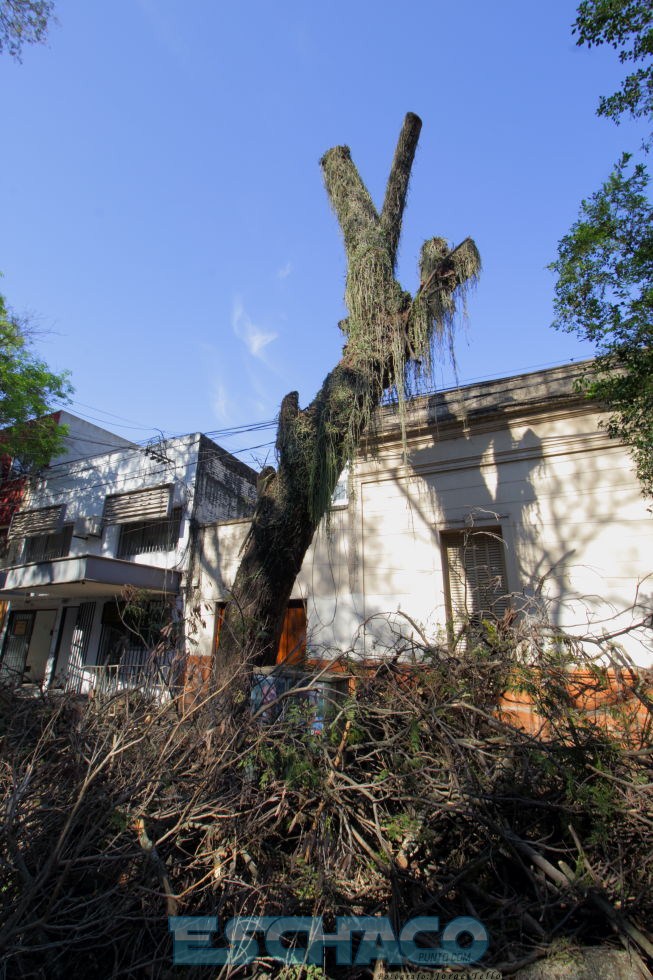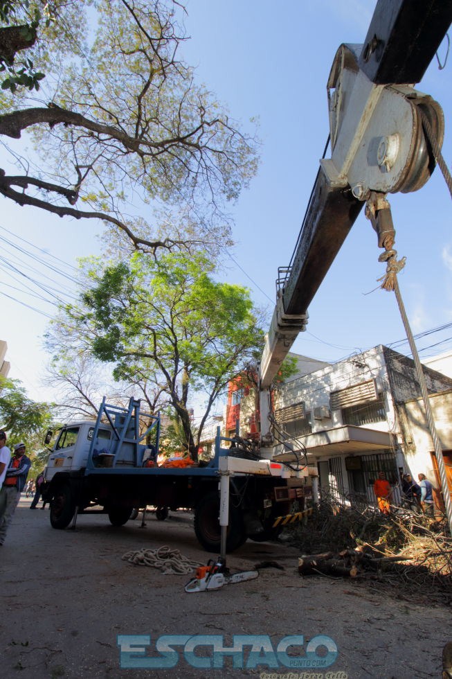 Desde la noche del lunes, por precaución se cortó el tránsito en el sector. En un principio, estaba programada una mera reducción de copas por lo que primero se cortaron las ramas del lado que se producía el declive. Sin embargo, una vez que los técnicos acudieron al lugar se pudo constatar que dicho árbol no contaba con raíces en uno de sus lados, como así tampoco una base sólida para su sostenimiento debido a la existencia de un cableado telefónico y eso podría provocar en poco tiempo su eventual caída. Ante esa situación, el municipio procedió a la poda total de ese ejemplar con la utilización de una grúa de gran porte.