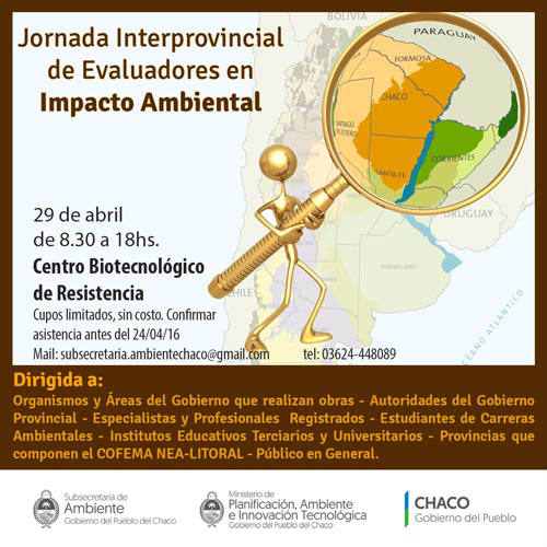 El Ministerio de Planificación, Ambiente e Innovación Tecnológica, a través de la Subsecretaría de Ambiente de la provincia del Chaco, realizará la Primer Jornada Interprovincial de Evaluadores Ambientales. El Encuentro se llevará a cabo el próximo viernes 29 de abril en el auditorio del Centro Biotecnológico Forestal situado en Av. Sarmiento y Colectora Nicolás Avellaneda.