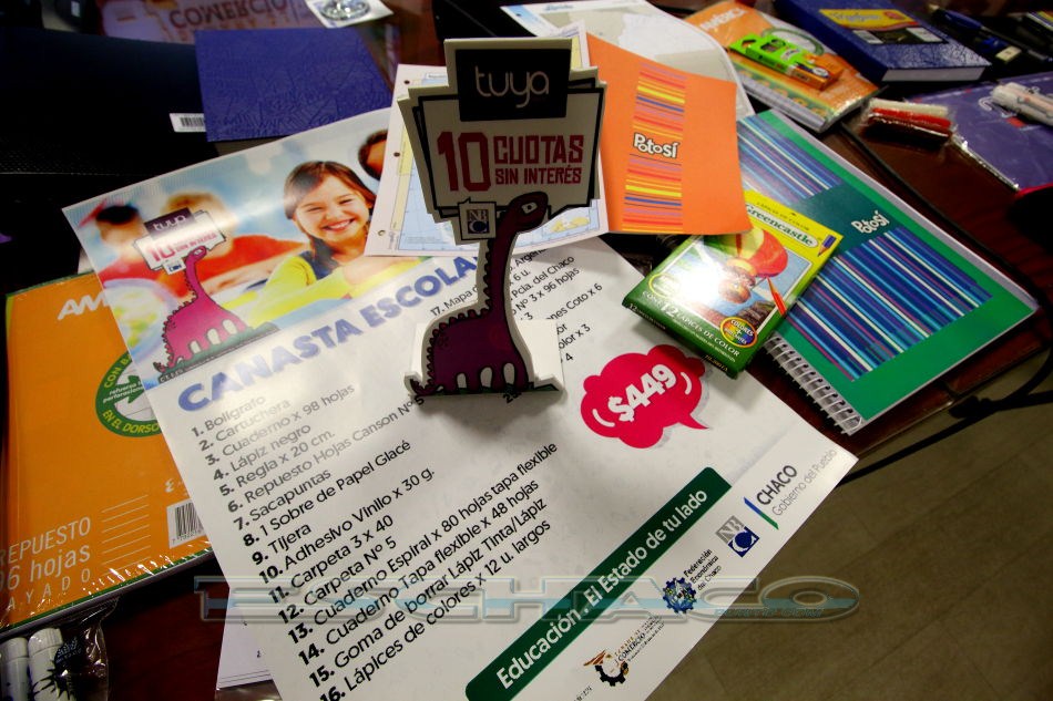 Representantes del gobierno provincial, la Cámara de Comercio, el Nuevo Banco del Chaco y del rubro librerías, supermercados e indumentaria escolarpresentaron la canasta escolar 2017, la cual consta de 25 artículos, a un precio excepcional de $449, apuntados a satisfacer los requerimientos de los niveles pre escolar, primario y secundario. La promoción estará vigente desde el 20 de febrero al 31 de marzo de 2017, inclusive.