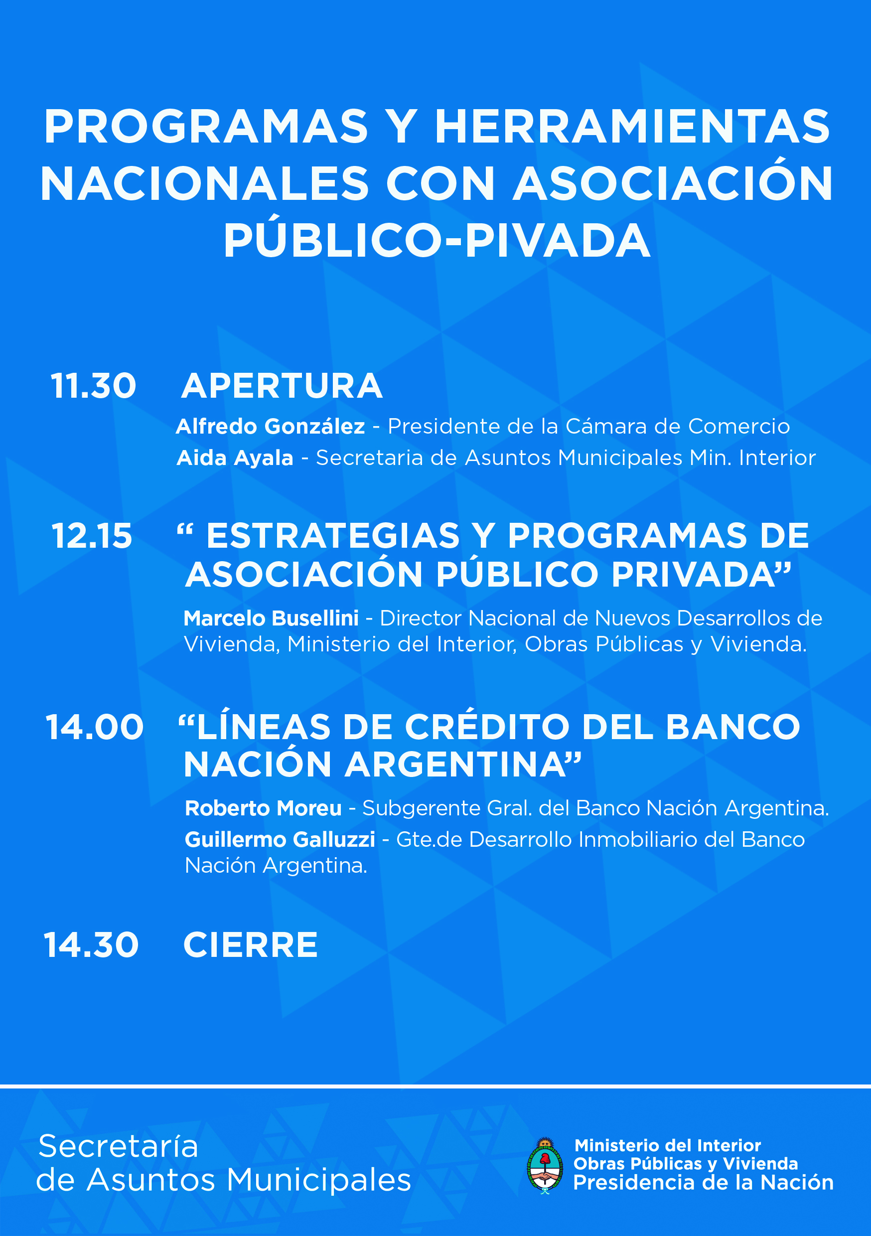 A las 12.30 dará inicio la primera disertación sobre “Estrategias y Programas de Asociación Público Privada” a cargo del Director Nacional de Nuevos Desarrollos de Vivienda de la Secretaría de Vivienda y Hábitat del Ministerio del Interior, Obras Públicas y Vivienda de la Nación, Marcelo Busellini. Luego a las 14.00 expondrán sobre “Líneas de Crédito del Banco Nación Argentina” el Sub Gerente General, Roberto Moreu, y el Gerente de Desarrollo Inmobiliario, Guillermo Galluzzi. El cierre esta previsto para las 14.30 horas.