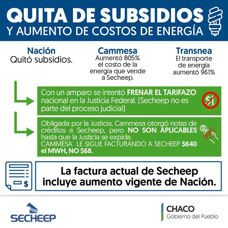 Respecto a la medida cautelar de la Justicia Federal, Secheep recordó que “no es parte de dicho proceso judicial”, y que por el momento, Cammesa sólo le envió notas de créditos por facturaciones “a futuro” y nunca le devolvió dinero alguno ni re-facturó los periodos de 2016. En ese sentido, agregó que tras solicitar judicialmente que se brinde estos detalles, la jueza (Zunilda Niremperger) fijó una audiencia para el 6 de junio, donde se dirimirá la situación, y que en caso de que se resuelva que se deba devolver algún monto, Secheep lo hará en créditos a futuro, tal cual lo realizaría Cammesacon el Chaco.