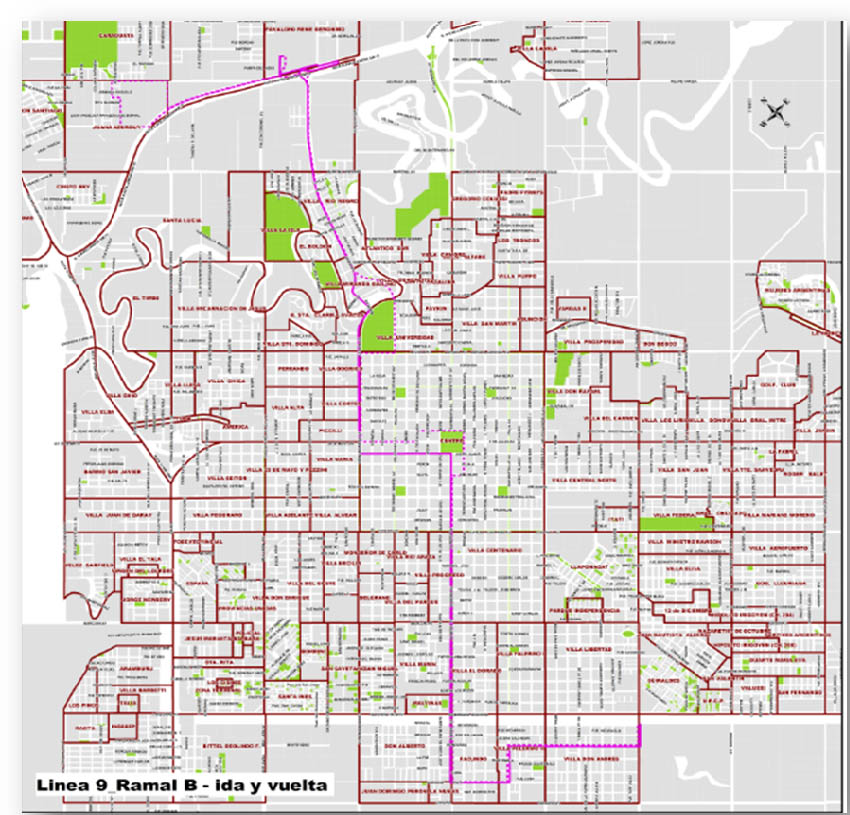 La línea 9, en caso de lluvias en zona del hipermercado Libertad realizará la ida de la siguiente manera: por colectora Norte desde avenida Coronel Falcón, dará la vuelta y e ingresará al barrio 130 Viviendas hasta el final de la calle La Cangalle. Allí dará la vuelta y retornará al centro por el ramal A.