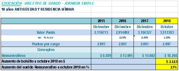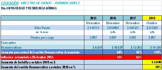 Ocampo explicó que en 2015 un maestro de grado jornada simple –sin antigüedad y residencia mínima- cobraba 6.670 pesos, y que en 2016 pasó a cobrar 10.639 pesos. “Esto significó un aumento del 60 por ciento, mientras que la inflación acumulada fue del 33%”, detalló. Asimismo, recordó que con el acuerdo salarial de 2017, los docentes recibieron un aumento acumulado del 84%, estando la inflación al 63%. “Hoy proponemos un aumento del sueldo remunerativo, a octubre, de un 18%, cuando la inflación proyectada es del 15%”, expresó.