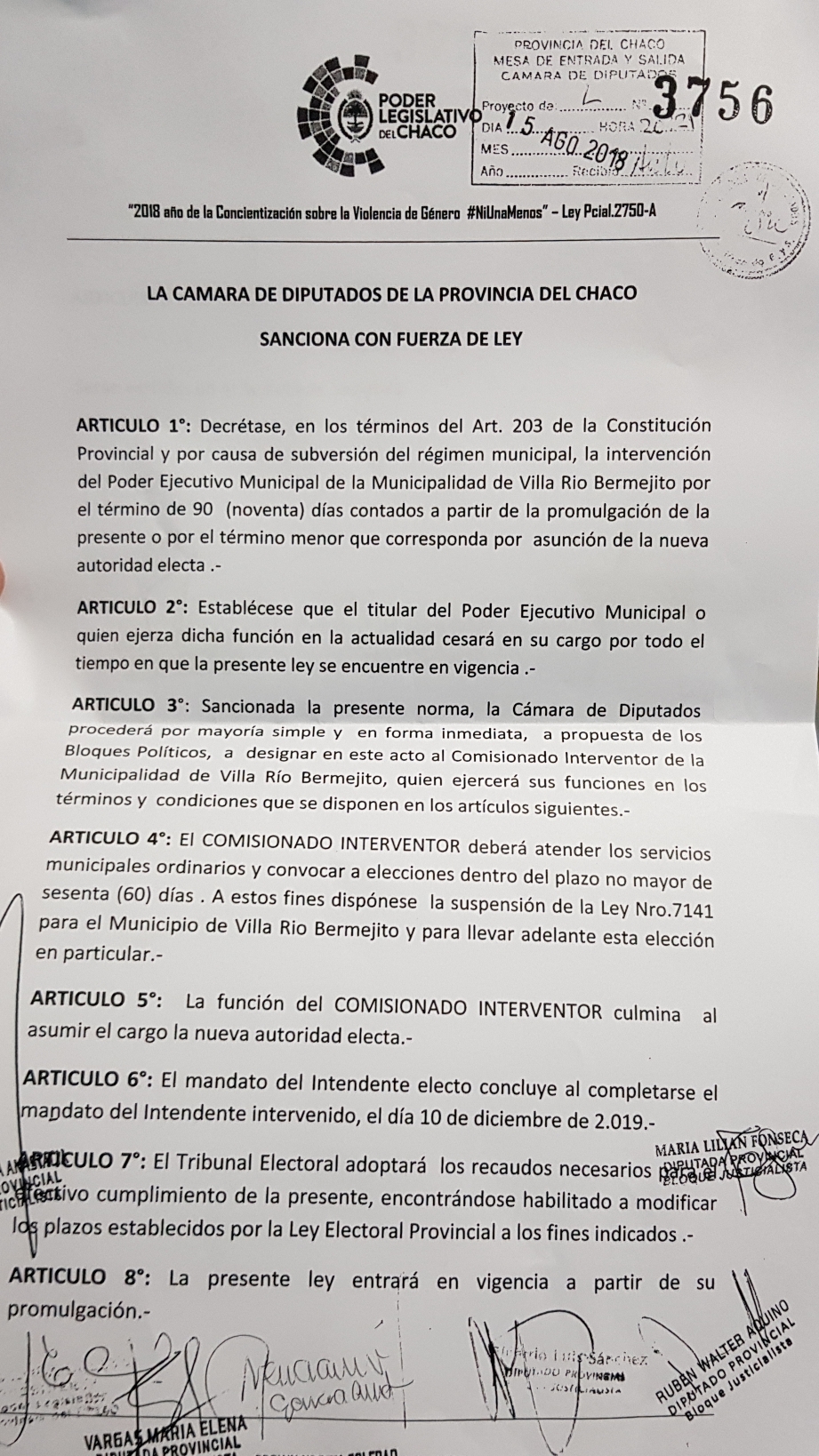 Dentro del articulado se establece que en los términos del Art. 203 de la Constitución Provincial y por causa de subversión del régimen municipal, la intervención del Poder Ejecutivo Municipal de la Municipalidad de Villa Rio Bermejito por el término de 90 (noventa) días contados a partir de la promulgación de la presente o por el término menor que corresponda por asunción de la nueva autoridad electa.
